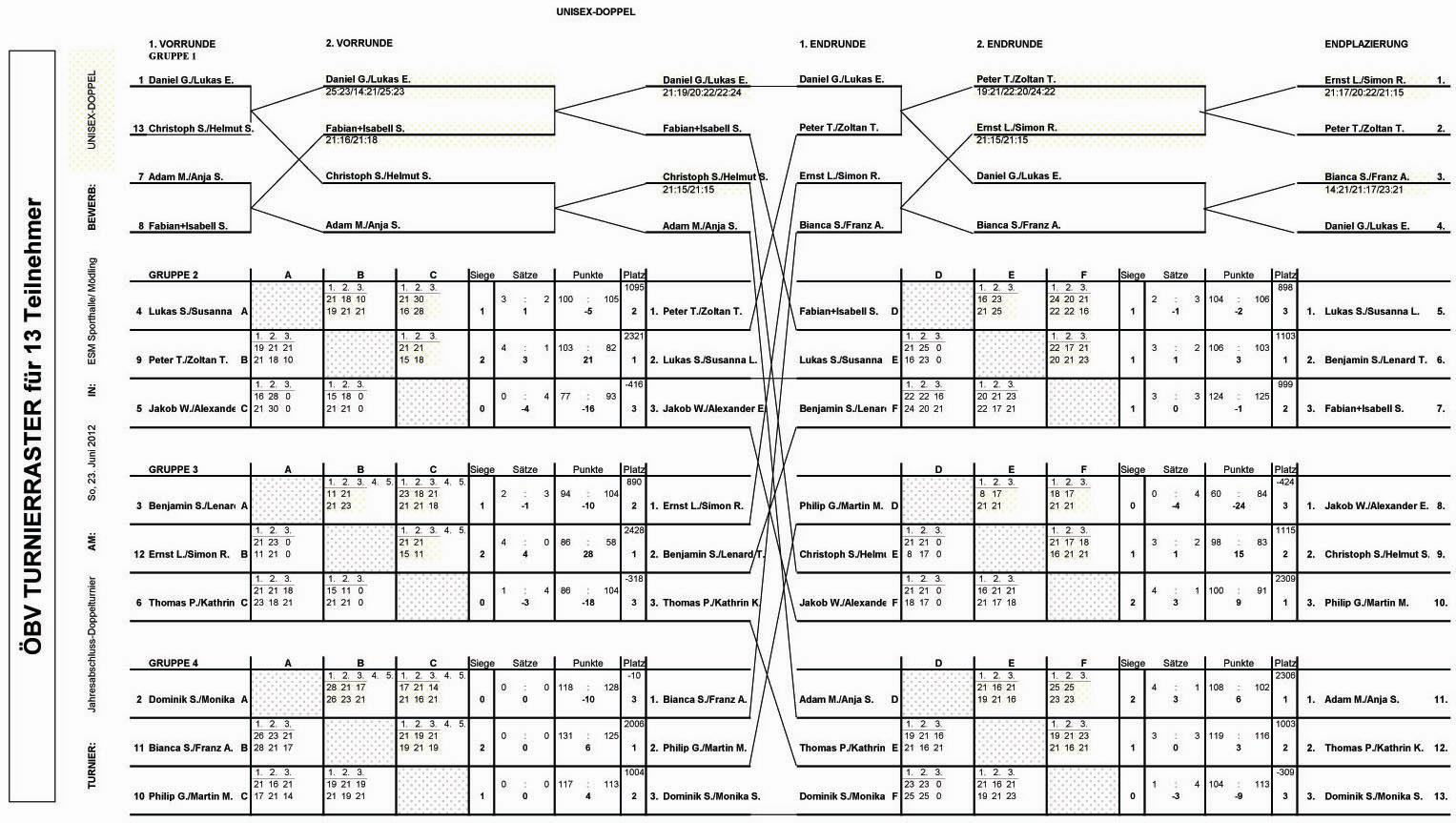 An dem vereinsinternen Unisex-Doppelturnier nahmen 26 Spieler- u. Spielerinnen teil. Die Turnierleitung gesetzten SpielerInnen aus den ersten vier Töpfen wurden FreizeitspielerInnen und SchülerInnen zugelost und die Setzplätze bestimmt.