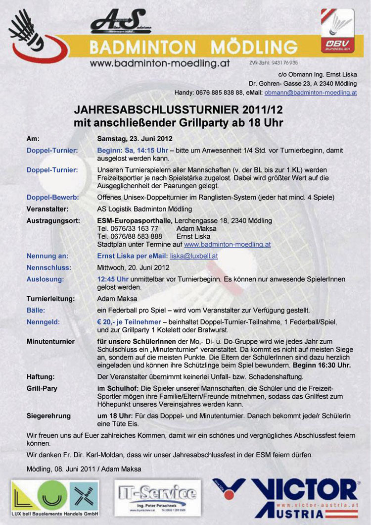 JAHRESABSCHLUSSTURNIER 2011/12 mit anschließender Grillpary am Sa, 23.06.2012