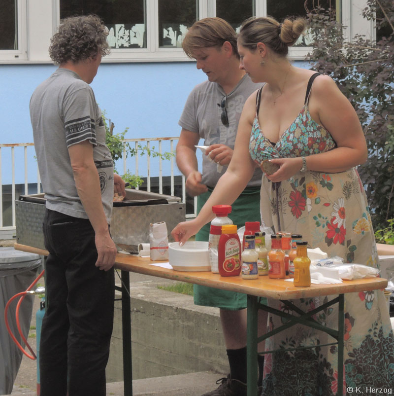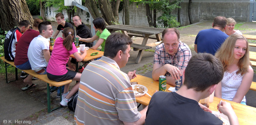 Jene Mitglieder und deren Freunde, Verwandte, Bekannte u.s.w., die nicht am Doppelturnier teilnehmen, kommen zur Grillparty um 18:00 Uhr in den Schulhof. Über den Eingang zur Sporthalle gelangen die Gäste in die Aula der Schule und von dort über den Speisesaal in den Schulhof.