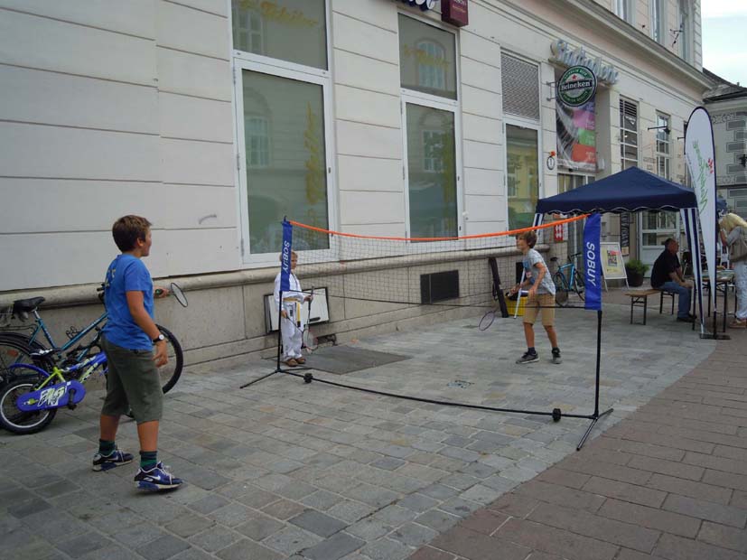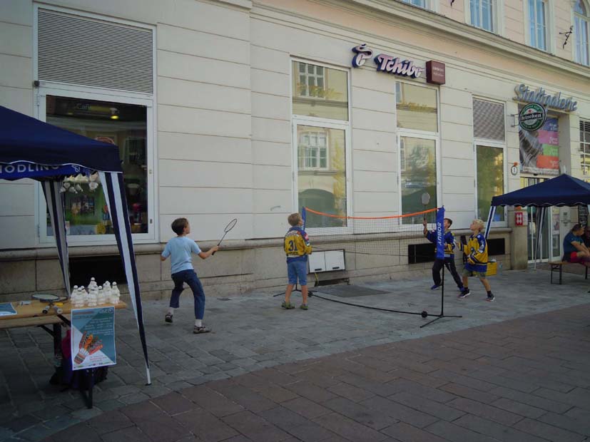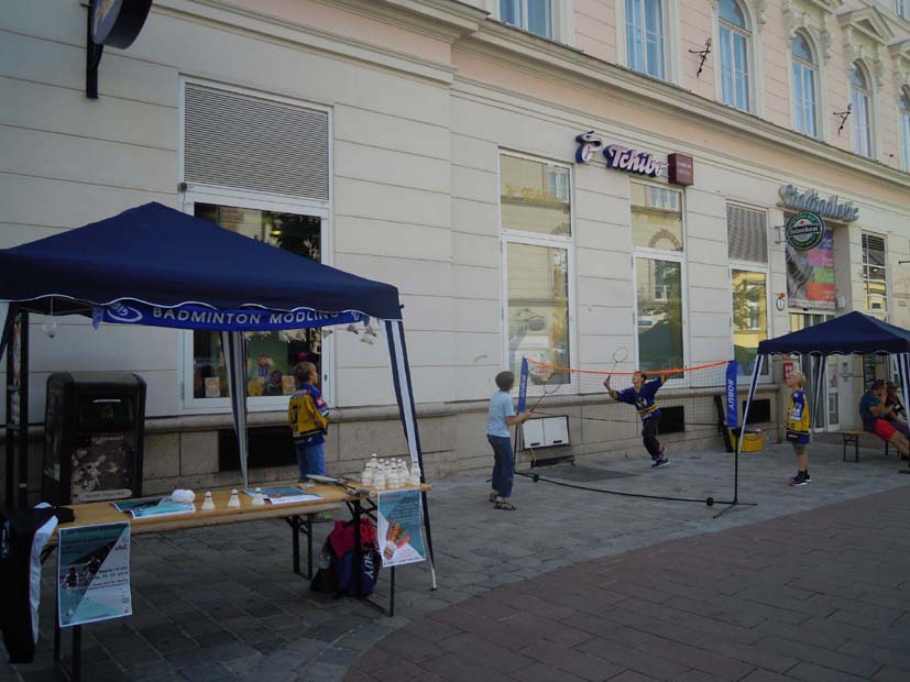 In der Mödlinger Fußgängerzone fanden sich insgesamt 18 Vereine ein, um sich zu präsentieren. Auch unser Verein war wieder mit einem eigenen Stand dabei, welcher von Schriftführerin Malou Schaub sowie BL-Spielerin und Trainerin Bianca Schiester betreut wurde. Das Wetter war sonnig und warm und lockte somit sehr viele Menschen in die Fuzo. Einige Vereine präsentierten ihren Sport durch eine Vorführung auf der Bühne. Aufgrund der "Windanfälligkeit" eines Federballs ist das für den Badmintonsport natürlich nicht so einfach, jedoch gab Malou Schaub an dieser Stelle ein kurzes Interview, in dem sie den Verein präsentierte.