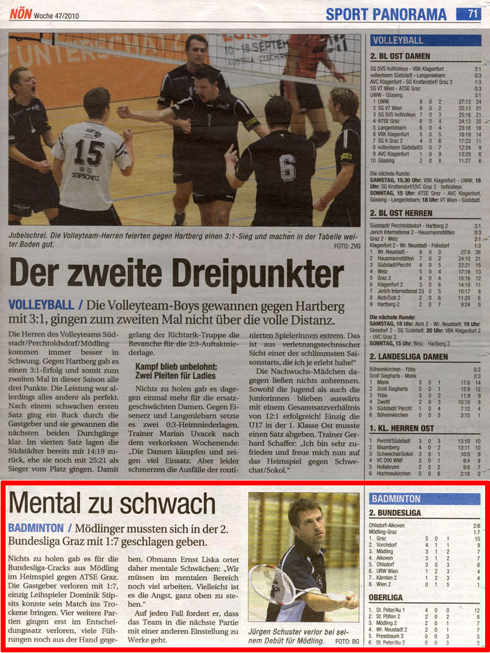 Die Mödlinger Mannschaft musste sich gegen den Tabellenführer aus Graz mit 1:7 geschlagen geben. Die Deutlichkeit des Ergebnisses trügt jedoch ein wenig. Insgesamt gab es 5 drei-Satz Partien.