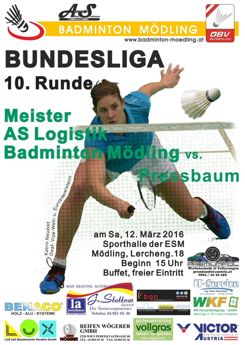 Am Samstag, 12.03.2016, fand mit dem NÖ Derby AS Logistik Badminton Mödling vs. ASV Pressbaum die letzte Runde des Grunddurchganges der Badminton Bundesliga statt. Mit einem 6:2 Sieg konnten wir uns zum dritten Mal in Folge den ersten Platz im Grunddurchgang sichern!